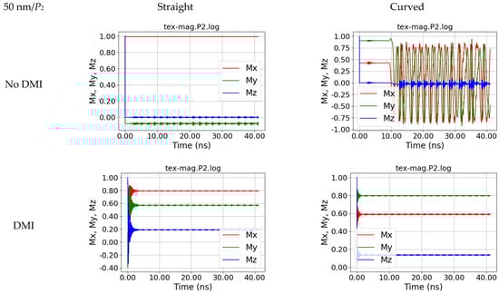 Magnetization dynamics in position P2, i.e., at the left end of the fiber, for a straight and a curved nanofiber, simulated without and with DMI, for s = 50 nm.