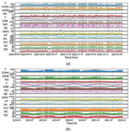 We use two datasets for the proposed models to learn, including the 4 months power data with a resolution of 5 min, from 1 September 2020 to 31 December 2020, a total of 34,080 samples, and the 4 years PV power data with a resolution of 1 h, from 2017 to 2020, a total of 33,740 samples. Figure 2 displays the historic PV time series of two datasets, where the label of the vertical axis is the abbreviation of all variable names in the data set, and the horizontal axis represents the length of the time step of the data set.