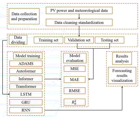 ADAMS and six other experimental competitive models are suggested in this work. Autoformer, Informer, Transformer, LSTM, GRU, and RNN are the baseline models. Data collection, data preparation, data dividing, model training, model evaluation, and results analysis are all included in the fundamental building blocks of STPVF. Figure 3 depicts the entire experimental flow diagram, and Table 1 includes a list of the parameter settings for models like the ADAMS.