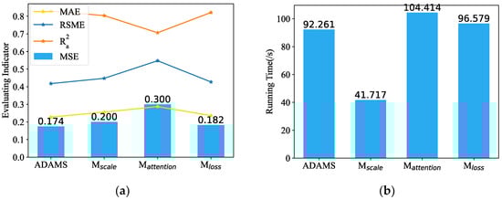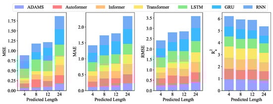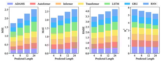 On the 5 min resolution dataset, we contrast and examine the suggested model with the other six models. In the experiment, obviously, the suggested model has performed uniformly the best of all the models. Table 2 lists the thorough analyses of the predicted outcomes. Figure 4 displays the visual bar chart. Figure A1 shows the visual scatter plot. According to Table 2, ADAMS achieved the best MSE of 0.061 in the forecasting of length-4, whereas Autoformer, Informer, Transformer, LSTM, GRU, and RNN achieved MSEs of 0.116, 0.076, 0.063, 0.304, 0.190, and 0.146, respectively. As can be observed from Figure 4, when the forecasting interval is extended to length-24, the prediction errors for most competing approaches worsen. The suggested model exhibits better predicting performance for all four forecasting lengths within 120 min for data with a 5 min resolution. The prediction precision of all models exhibits a general tendency of declining with increasing length.
