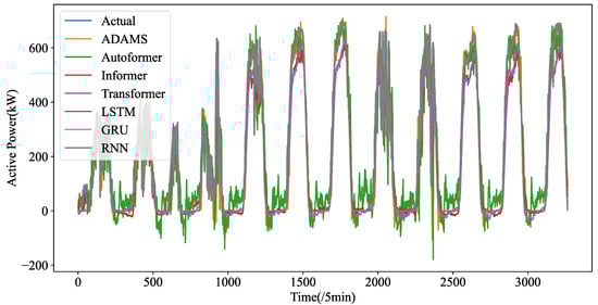The forecasting curves of each model for the length-24 forecasting results (5 min resolution data): (a) ADAMS; (b) Autoformer; (c) Informer; (d) Transformer; (e) LSTM; (f) GRU; (g) RNN.