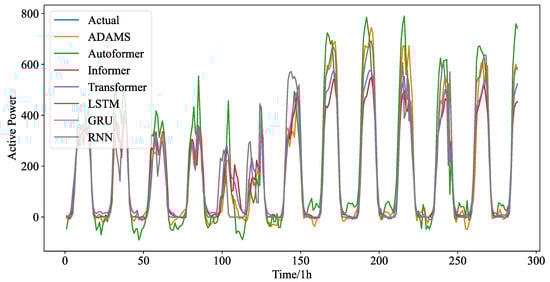 Figure 5 shows the forecasting curves of all models for the length-24 forecasting results. The forecasting curves of each model are shown in Figure A3. We can observe that ADAMS is also proved to be the most successful model in reconstructing the fluctuation details. One-step prediction models, e.g., LSTM, GRU, and RNN are frequently used; multi-step prediction procedures will cause significant error accumulation issues. In particular, the prediction mistake from the earlier forecasting would accrue in the upcoming forecast, adding significant forecasting bias and leading to much higher MSE. Additionally, the PV power data patterns are very intricate. Their ability to learn historical details will be severely hampered by the limited computer memory. They cannot effectively learn global patterns in their memory cell without a heuristic selection process. Instead, they are only able to recall patterns in extremely small ranges, which could interfere with forecasting. The four transformer-based prediction models perform well in terms of accuracy. Too many variations have been predicted by models such as LSTM and RNN, which is referred to as the overfitting phenomena. The approximate fluctuation curves have been effectively reconstructed by Autoformer, Informer, and Transformer, however certain crucial elements have not been precisely predicted. In contrast, ADAMS accurately restores a number of significant information, including minor variations and turning points, which constitute the better understanding of the time series.