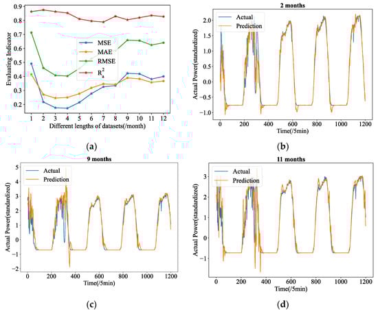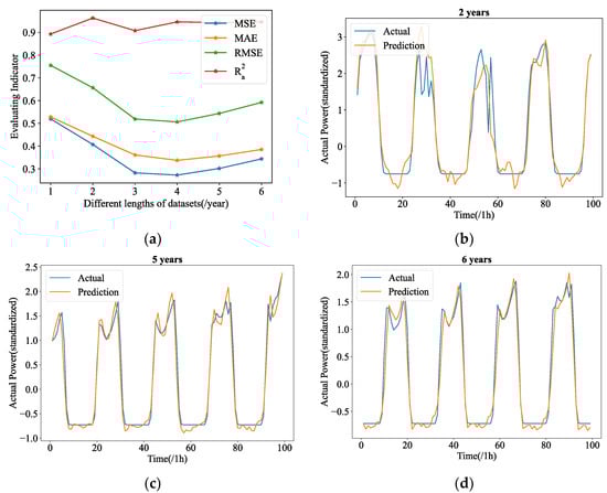 where is the amount of PV energy sample points utilized to calculate the prediction error, is the actual PV power values, is the mean of the prediction period taken into consideration, and is the predicted values. MSE is a frequently employed metric to assess the efficacy of time series forecasting. In this paper, all baseline models used the MSE as a loss function. The real circumstance of the error between the forecasting value and the actual value can be better reflected by MAE because it is less sensitive to outliers. RMSE is prone to high values and accentuates the distance between significant mistakes. Better performance is indicated by these indicators’ lower levels. denotes R-squared and it represents the percentage of variance that the model accounts for and displays the correlation between forecasted and actual values. By considering the effects of additional independent factors that have a propensity to distort the outcomes of measurements, , a modified form of , increases accuracy and reliability. Its value ranges from 0 to 1. The lager value of this indicator means better performance.