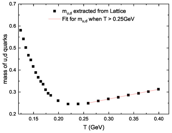 The mass of u and d quarks at vanishing chemical potential derived from the lattice data [52], which is fit to analytic form Equation (32) discussed in the text.