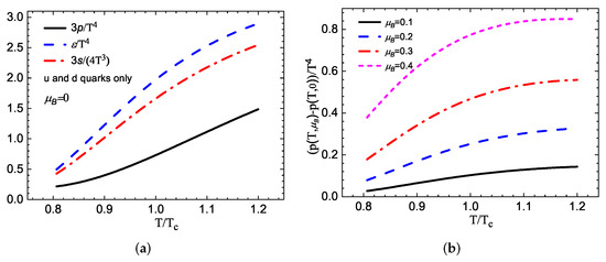 The derived thermodynamic quantities by considering the u and d quarks, where the s quarks, gluons, and anti-particles are not explicitly taken into account. (a) The pressure , energy density , and entropy density as functions of the temperature at vanishing chemical potential, where GeV in accordance with lattice QCD data. (b) The difference in pressure between the states with finite and vanishing chemical potential is shown as a function of temperature .