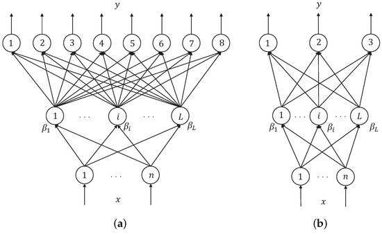 Inspired by the above examples and binarized neural networks, the binary method is proposed instead of the one-hot method in this paper. The specific description of the binary method is as follows: Suppose with , and p output nodes are utilized and, simultaneously, the ideal outputs are encoded into binary numbers. Take the 4-classification problem as an example; two output nodes are needed, and these four classes are labeled by , , and , respectively. It can be seen that when the class number is higher, the output node number that the binary method can reduce is greater. In the binary method, the output node number has been significantly reduced, which leads to a reduction in the number of hidden-output weights. In the storage process, lots of storage space will be saved. Moreover, in numerical experiments, the computational speed will also be improved because of the reduction of the weight number. The experiment part proves that compared with the conventional one-hot method, the binary method can reduce the output nodes and hidden-output weights without damaging the learning precision.