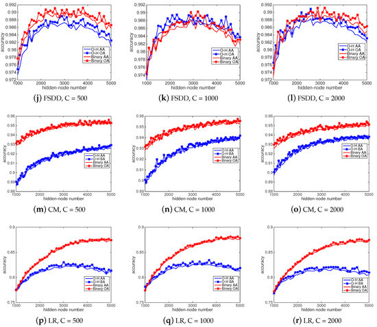 Figure 3 exhibits the OA and AA with different hidden-node numbers and regularization parameters. Overall, eighteen-pair experiment results are obtained: The binary method can achieve obviously higher accuracies than the one-hot method in thirteen (case: a, b, c, g, h, i, j, m, n, o, p, q, r) out of the eighteen cases, while the binary method performs worse only in case d; And for the rest of the four cases (case: e, f, k, l), the accuracies of these two methods are similar, one is never better than the other.