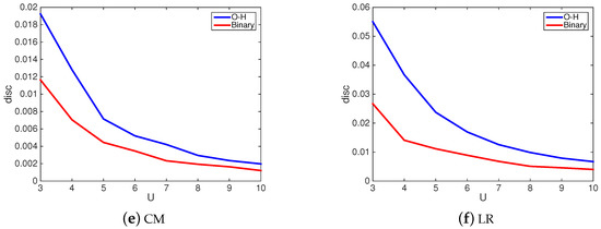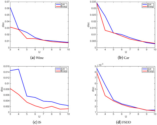 Sensitivity to hidden-node number based on the binary (red line) and one-hot (blue line) methods. The term “disc” represents the abbreviation of average accuracy discrepancy.