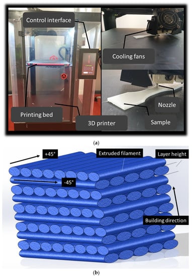 Additive manufacturing is one of the break-through technologies that has attracted many research areas for designing and manufacturing products with a large degree of freedom in design and architectural complexity [1,2]. This processing route for material processing can be defined as a manufacturing layer by layer technique from a digitalised model [3]. One of the distinctive features of AM is its ability to control the material laying down at a relatively fine scale [4]. Several manufacturing routes fall within the definition of AM [5,6]. One of the most known is fused deposition modelling, which is used to process polymeric structures [7,8]. In this process, the material is extruded as a filament from a near 1.75 mm in diameter as-received filament down to 0.1–0.4 mm extruded filament [9]. The motion of the printing nozzle that contains the extrusion space, and the building platform on which the filament is laid down, creates the 3D shape of the material by exploiting the rheological properties of the polymeric filament to quickly solidify after passing its thermal transition [10,11]. This process generates a particular symmetry in the material due to the crossing of filaments at particular angles [12]. The material is only continuous in one direction, which leaves two directions in which the material discontinuity materialises as a defect in cohesion between adjacent filaments called necking, but also through the building direction [13]. The presence of these discontinuities influences the mechanical performance of the parts [14]. For instance, tensile properties measured in the direction parallel to the building direction are several orders of magnitudes lower than the same properties measured in the normal directions [15]. The examination of the literature mentioned above reveals the need to conduct in depth studies to measure the footprint of the printing process on the performance of technical parts. The study of the sensitivity of process parameters on the mechanical performance of printed structures has received much attention among the community of AM users [16,17,18]. Sood et al. [17] considered the role of several printing parameters such as part orientation, layer thickness, and raster angle on the tensile, flexural, and impact properties of ABS material. Tanikella et al. [18] studied the tensile performance of different materials by varying the part orientation and printing temperature. One of the main process parameters that contributes to tune the mechanical performance is part orientation [19,20], which is found to significantly determine the amount of loss in properties depending on the loading pattern [19]. In addition, the way the filaments are arranged within the building plane is also an influential factor [21]. Generally speaking, the filaments are organised in layups with a crossing configuration at −45°/+45° [22]. These layups are complemented by an external frame, i.e., an external contour to improve the structural stability of the printed part [23]. Dawoud et al. [24] considered the role of the printing angle corresponding to different layups on the performance of ABS material. The authors showed that the load bearing capabilities are significantly improved when the selection of the printing angle allows filaments to be aligned in the loading direction.