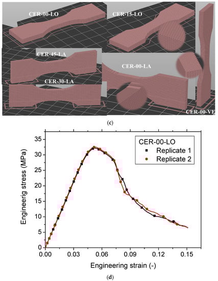 (a) Illustration of the fused deposition modelling technique; (b) filament arrangement in 3D printed parts; (c) printing configurations using a combination of orientation and printing angle; and (d) typical stress—strain response for two replicates.