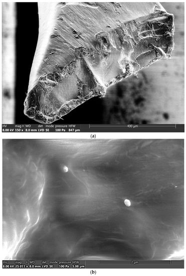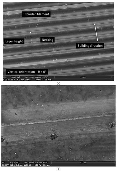 Figure 3 shows the out-of-plane layered structure corresponding to the vertical orientation, which is taken at an area far from the rupture region. Continuity in material structuring goes normal to the building direction (Figure 3a). The distance between adjacent filaments is nearly 200 µm, which also refers to the layer height. The central part of the filament appears smooth. However, the junction between adjacent filaments highlights a gap called necking. A close view of the necking (Figure 3b) reveals a textured white large structure of about 100 µm in width. This area emerges as a result of the deformation induced by the packing as the filament is forced to reduce its lateral dimension for 400 µm to 200 µm in the building direction. The cohesion between the filaments in this direction is only ensured by the limited contact area, which makes the 3D printed structure vulnerable to uniaxial loading along the same direction.