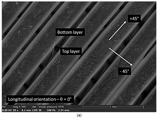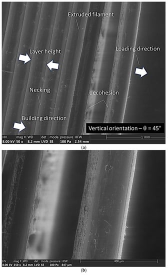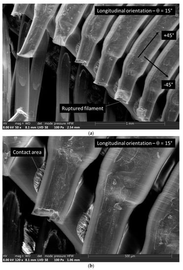 The in-plane arrangement of filaments for a sample printed according to the longitudinal orientation is shown in Figure 4. In order to highlight the filament crossing at +45°/−45° within the raster, the observed area is selected near the ruptured region where the stretching of the filaments allows both bottom and top layers to be viewed. Besides the limited connectivity between adjacent filaments within the same layer, filaments are cohesively connected between layers, where the contact area is substantially larger than for printed samples according to the vertical orientation. This connectivity confers to the printed part a tuneable performance depending on the relative orientation between the loading direction and the raster angle [29,30].