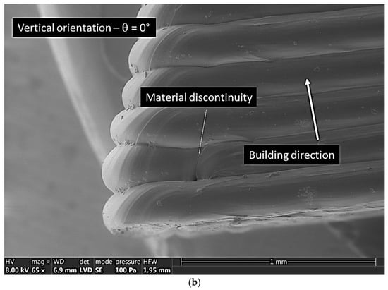 In addition to the raster that is defined by the in-plane filament arrangement within the core of the sample, an external frame is added to confer more structural stability. Figure 4b shows the structure of this external frame along the edges in the case of a sample printed according to the vertical orientation. At the edges of the printed structure, the filament dimension is affected by both the compression of the top layers and the deceleration of the printing nozzle that occurs when trajectory changes drastically close to the edge. In addition, after the completion of the frame, the printing nozzle moves to the next position, which leaves a discontinuity as the one shown in Figure 4b.