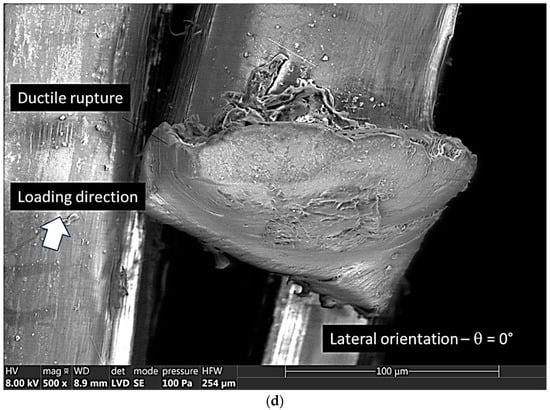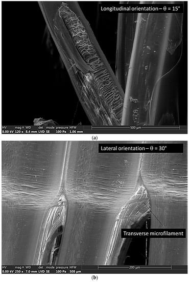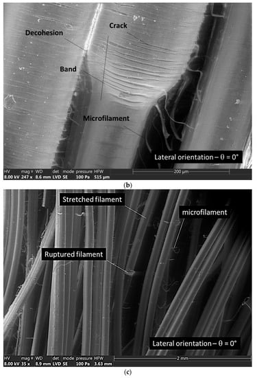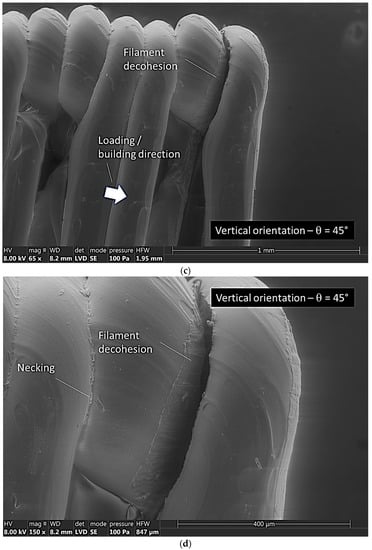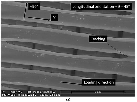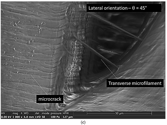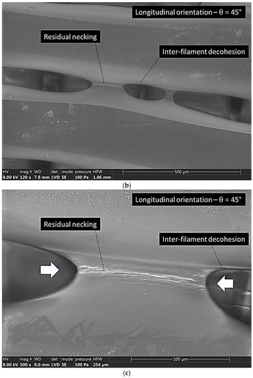 Figure 9a shows the effect of an intermediate printing angle between 0° and 45° for a sample printed according to the longitudinal orientation. This figure exhibits partial detachment of the filament, which is induced by a large contact area between two successive filaments. This induces particular fracture patterns with significant deviation as illustrated in the former work by Khosravani et al. [36] for raster angles between 30° and 60°. The amount of damage observed is directly related to the extent of connectivity that is induced by the printing angle. In Figure 9b, the combination of lateral orientation with a printing angle of 30° allows more filaments to be more aligned with the loading direction. As a consequence, the localisation phenomenon introduced earlier results in the partial detachment of filaments according to the same mechanism shown in Figure 6b. However, the larger load transfer triggered by a larger printing angle (30°) allows more the microfilaments to act transversely against longitudinal cracking. This is further enhanced when the printing angle is increased to 45° (Figure 9c).