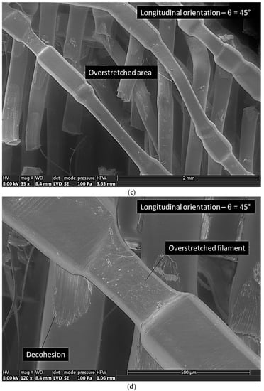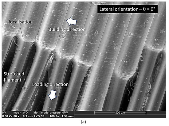 Figure 7a shows the last configuration among the possible part orientations, which is the longitudinal orientation. In this configuration, the filaments are stretched in a predominant +45°/−45° arrangement. This means that only a partial load transfer is obtained in the loading direction. This partial load transfer limits the stretching of the filaments compared to the previous filament arrangement (Figure 7a). A zoom-in view on the ruptured filaments shows the change of orientation of the filament observed in Figure 7b, which is a distinctive feature of the longitudinal orientation. This orientation shows also superior performance compared to the vertical orientation. This is confirmed by Ambrus et al. [35] in the case of a PLA-copper filament, where the tensile strength was found superior for the horizontal orientation. In addition, out-of-plane decohesion between successive layers generates an inhomogeneous deformation for which the extent is guided by the width of the contact area. In fact, the filaments are overstretched between the contact points which act as anchoring points. Figure 7c provides proof of the development of inhomogeneous stretching, for which the overstretched areas can be as large as 2 mm. A closer view of the overstretched filament does not show the presence of significant cracking bands. In addition, the transition between overstretched and under-stretched areas is abrupt.