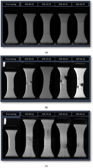 Deformed structures captured at the end of the tensile loading showing the combined effect of printing angle and orientation: (a) vertical, VE; (b) longitudinal, LO; and (c) lateral, LA orientations.