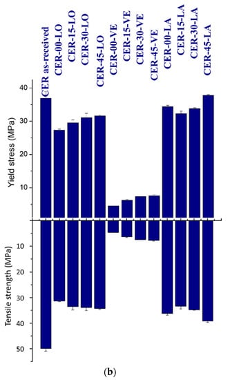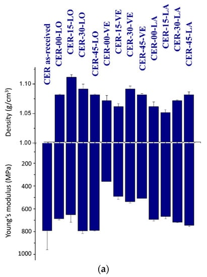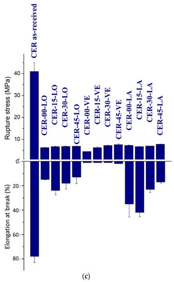 Observed tensile performance of CER versus printing conditions. In the nomenclature CER-XX-YY, CER is PLA-ceramic filament, XX is the printing angle, and YY is the printing orientation. (a) The density and Young’s modulus; (b) yield stress and tensile strength; and (c) ultimate stress and elongation at break.