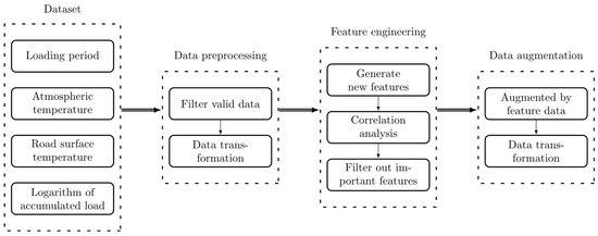 The framework of the rutting data augmented model based on RBFNN is shown in Figure 4, which includes data preprocessing, feature engineering, and data augmentation.