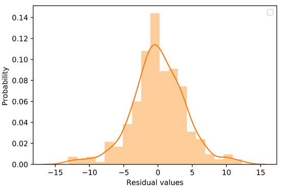 Figure 8 shows that the residuals of the model results in this paper are close to a normal distribution. To better test the distribution of model prediction residuals, the K-S test [48] is used to test whether the residuals of the model in this paper obey the normal distribution to verify the model’s reliability. When the significance level is 0.05, the statistic calculated by the K-S test is 0.06294, and the p value is 0.16181 (>0.05), which does not violate the original hypothesis, indicating that the prediction residuals of the model obey the normal distribution.