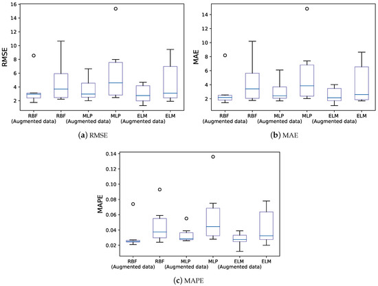The regression estimation of rutting depth is tested to verify whether the augmented rutting data can be used in other tasks. This paper compares the training results before and after data augmentation for different NN algorithms, such as RBFNN, MLP, and ELM algorithms. For RBFNN, ELM, and MLP, 9 input nodes, 28 hidden nodes, and 1 output node are set up to perform regression estimation on the rutting depths of six pavement structures of STR2, STR5, STR8, STR11, STR12, and STR18, respectively. Boxplots of the performance of each algorithm on RMSE, MAE, and MAPE are shown in Figure 9.