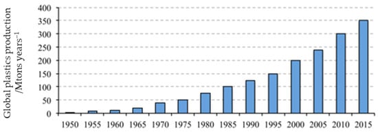 Plastic is a non-degradable material that can persist in the environment for long periods of time []. On the other hand, it is a very special material with a great number of advantages: it is affordable, versatile, light, and resistant [,]. Plastic originates from petrochemicals and contains mostly hydrocarbons and some additives, such as antioxidants, flame retardants, and stabilizers, which make the material very bio-undegradable []. Thanks to its unvaluable properties, plastic can be used for many different functions []. A total of 44.8% of all plastics produced in 2015 were used for packaging purposes, and 18.8% in the building and construction industry []. Other big plastic consumers are the textile industry, consumer and institutional products, transportation, and electronics []. The exponential growth of plastic production is shown in Figure 1 []. Chemical resistance is well known to be one of the most important properties of plastics. As a result, land, water, and oceans become easily polluted by plastic waste, implying serious risks for the survival of living organisms [] and important impacts on wildlife, natural surroundings, and human health [,,].