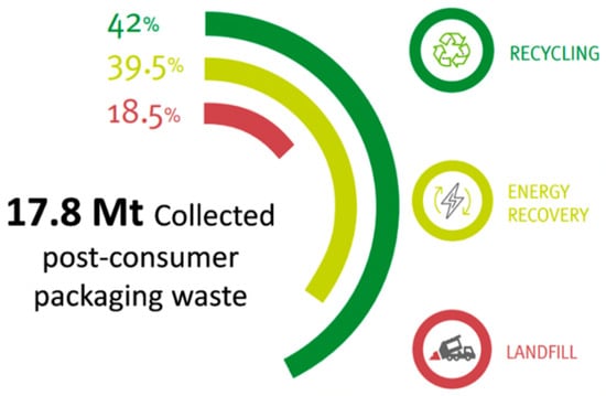 Plastic waste is commonly found as a component in municipal solid waste, with PE and PS as the main components of the heterogeneous mixture []. Plastic waste consists of different mixtures of plastic products, such as low- and high-density polyethylene (LDPE and HDPE, respectively), PP, PS, PVC, and PET. Plastic waste is bulkier than other organic residues and therefore a massive space is needed in landfills. This disadvantage is also responsible for the high cost of disposal and incineration of plastic waste. Additionally, plastic waste incineration and disposal lead to abundant emissions of harmful compounds [,]. As seen in Figure 2, a high percentage of plastic waste was still landfilled across Europe in 2018 [].