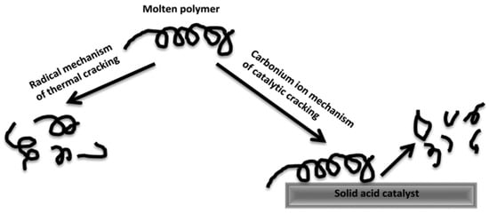 A basic scheme of polymer degradation in the presence of an acid catalyst is presented in Figure 3. Thermal cracking takes place on the outer surface of the solid catalyst, while the internal pores behave as channels for selective passage and further breakdown of larger hydrocarbons. As a consequence, gases are mainly produced in the small pores, while waxes are produced on the outer side of the catalyst. At the catalyst surface, low-molecular-weight hydrocarbons are produced that are volatile at the reaction temperature and can diffuse through the molten polymer film as final products, or can react further within the pores. The catalytic reaction is improved by microporous catalysts, producing gases and lowering the liquid product yield, with a better quality than in the case of catalytic pyrolysis with macropores [].