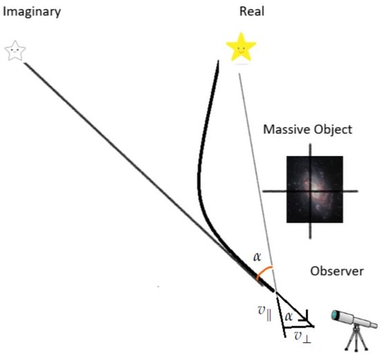Light traveling toward the observer is bent due to the gravitational field of a massive object, thus a distant star appears to the observer at an angle with respect to its true location.
