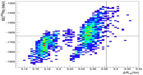 A typical picture is shown in Figure 1, where the values of the binding energy and the neutron skin are plotted. The main sequence does not seem to fulfill both constraints; nevertheless, several combinations of parameters appeared to satisfy both constraints. These were parameter sets with the 17 MeV boson admixture ranging between 20% and 40%. However, the parameter sets with a 20% admixture fail to satisfy constraints from heavy ion collisions [13], and thus only parameter sets with an admixture of 30% to 40% remain, signalling that there is some range of admixtures that satisfies all of the constraints. Such an observation can have physical meaning.
