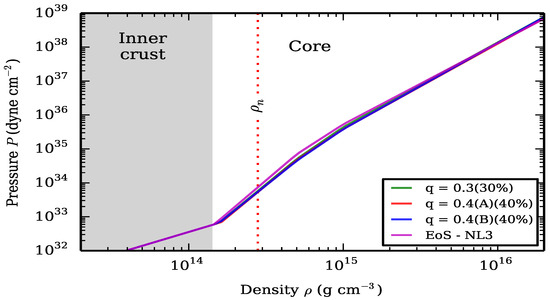 Polytropes for three EoSs plus the NL3 EoS used for the Tolman–Oppenheimer–Volkoff calculations. The 0.3 EoS represents a 30% admixture of the boson and the 0.4A and 0.4B EoSs represent a 40% admixture with different values of parameters and .