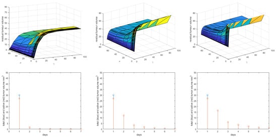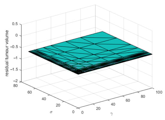 where a denotes the tumor growth rate, n the necrosis rate, and is the clearance rate on the Michaelis–Menten kinetics (mm/day). As the dead cells are naturally eliminated from the body, the necrotic volume does not depend on the past value, hence . The parameters and are the effects of drug concentrations and the synergic effect between tumor cells and chosen therapy. The dose-effect PD model is in fact a nonlinear gain (for a single drug) or a nonlinear surface (for multiple drugs) and can be considered as averaged effects of all therapies (in absence of real data at the molecular level to confirm this hypothesis) for the tumor and drug interactions: