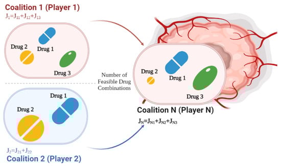 When analyzing systems with limited resources, noncooperative games have been proven to be good candidates for reaching Nash equilibrium (NE). To minimize the risk for drug resistance and side effects of drug therapy in patients and improve the quality of life in cancer-treated patients, it is desirable to minimize the amount of drug or intensity of radiation profiles. If we have multiple players denoting multiple therapy profile strategies, reaching NE implies solving the problem of finding the best strategy for one player, given all other players move at optimality solution. That is, it needs to determine the actions that players should take to achieve the best outcome in response to other players’ actions. In terms of finding the best treatment protocols, finding NE implies having an adaptive protocol strategy. If the drug selection remains constant, it represents that the number of players is constant. If the drug selection also varies, then it represents that the number of players in the game changes as well. The coalition consists of multiple agents collectively acting as a virtual player to minimize a coalition cost function, defined as the sum of all agents’ local cost functions, as represented in Figure 2.
