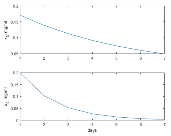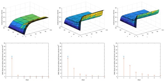 The following is a summary of the obtained results for various sets of the domain of feasible solutions within the coalition game optimality described in the prior section. The following settings were applied: sampling time of 1 day, optimality calculated per day with a recurrent prediction horizon of 7 days, fixed antiangiogenesis therapy as 0.171 mg/mL per day single dose weekly. Single-patient model settings were considered. A supporting immunotherapy profile has been administered as 0.2 mg/mL per day, a single dose weekly. The corresponding concentrations are depicted in Figure 3.