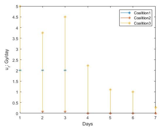The results of the three coalitions are given in Figure 5, Figure 6 and Figure 7, respectively. The results suggest the model-based control methodology presented here has clinical relevance in analyzing the effect on short-term tumor growth dynamics.