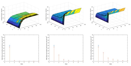 Coalition 3: results for various diffusion coefficients in terms of dose-effect surface and residual active tumor volume ( = 0.08 (left), = 0.03 (middle), = 0.007 (right)).