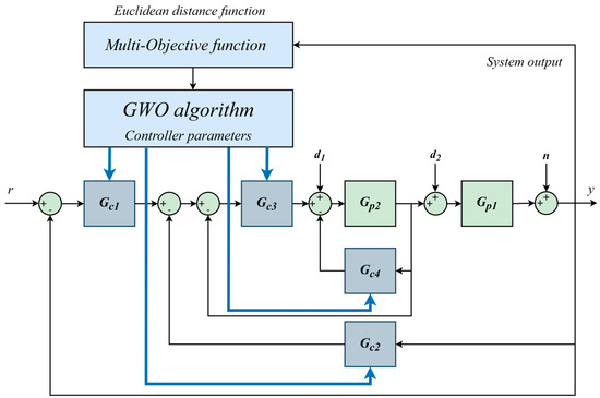 In the optimization algorithm, the multi-objective function is needed to tune the controller parameters using GWO. Assuming that the Euclidean distance function will perform well, the Euclidean distance function is proposed as a multi-objective function in the optimization algorithm. In mathematics, the Euclidean distance between two points in the Euclidean space is the length of a line segment between the two points. This implies that the Euclidean distance function is symmetrical regardless of which of the two points the starting point is and which is the destination. In the Euclidean plane, the distance between x and y is given by Equation (14) [28,29]. In the study, a multi-objective function is defined to minimize the distance between the target value and the actual value and it is given by Equation (15).