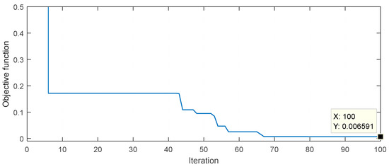 Firstly, the desired values of settling time, percent overshoot value, and steady-state error are determined for Example 1. While determining the multi-objective function, the settling time is targeted as 5 s and the percent overshoot value and steady-state error are considered as zero. These values are determined by taking the studies in the literature as a reference and aiming for the better values. By rearranging the multi-objective function according to the desired values, the optimization algorithm is run and the controller parameters are determined as in Table 1. The table also shows the controller parameters obtained for Examples 2 and 3. For all cases, the optimization algorithms are run 20 times with 100 iterations. For Example 1, it can be seen from the convergence curve in Figure 7 that the objective function reaches its value at approximately the 70th iteration. Since other examples have similar convergence curves, they are not presented in the study.