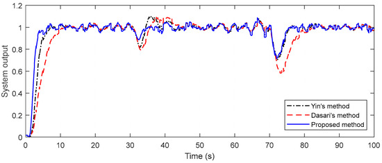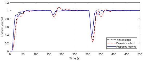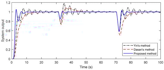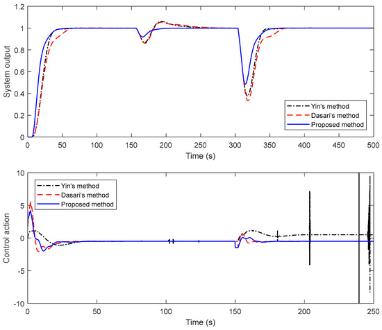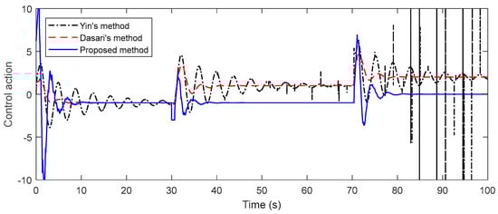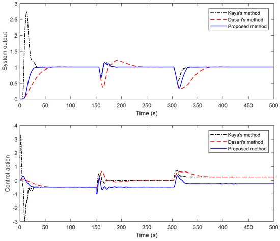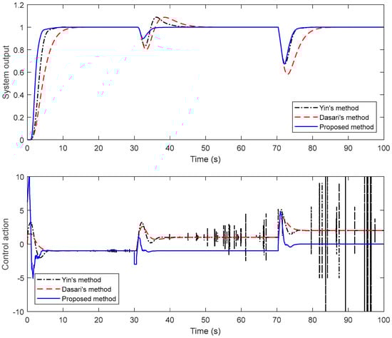To evaluate the performance of the proposed method, a comparison is achieved with some of the studies of Dasari et al. and Yin et al. The performance of the closed-loop system is assessed by giving a negative disturbance of magnitude 2 at t = 30 s and a negative unit step change in the disturbance at t = 70 s. For a fair comparison, disturbances in all of the examples are applied just up to the front of both the primary and secondary processes. System output responses and control signals are given in Figure 8. In Figure 8, it is conspicuous that the presented technique provides a faster response than the others and it gives very good results in both the first and second disturbance rejection. It is noteworthy that there are deteriorations in the control signals, especially in Yin’s method.