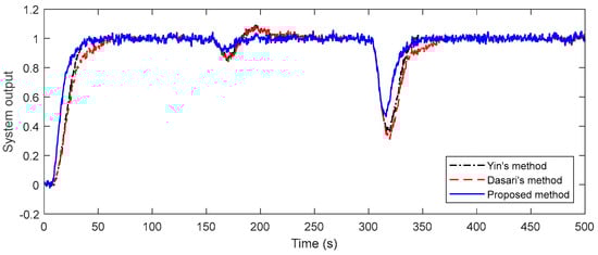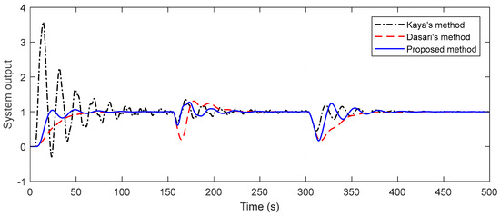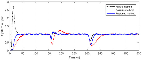 Considering this example, it can be accepted as a good response if the system’s settling time is 30 s or less than 30 s. The maximum overshoot and steady-state error are desired to be approximately zero. The multi-objective function created in this direction plays an important role in obtaining optimal controller parameters. The controller parameters in Table 1 are obtained after the optimization algorithm is run 20 times, each with 100 iterations. By using these controller parameters, simulation examples are realized by applying disturbances with a magnitude of −0.5 change at t = 150 s and t = 300 s. By putting the determined controller parameters in the control system, the system output response and control signal are obtained as in Figure 14. The figure also includes responses obtained from two different methods in the literature. When the methods are compared in terms of set-point tracking, it is noteworthy that Kaya’s method has an overshoot of about 270%, while Dasari’s method has a long settling time. While the proposed method provides a shorter settling time than the other two methods, the percent overshoot value is also zero. In terms of disturbance rejection, the proposed method outperforms Dasari’s method in both disturbances. Compared to Kaya’s method, similar responses are provided in the first disturbance. The settling time is the same, although there is a slight difference in the amplitudes of the second disturbance. Furthermore, appropriate control signals are obtained by all three methods. Robustness analysis is performed to see the performance of the control designs. The time delays in the primary and secondary processes are increased by 10%. The time constants are also reduced by 10% on both plants. For all of the methods, the closed-loop unit step responses of perturbed systems are presented in Figure 15. It is discernible from the figure that the proposed method provides a good response in both set-point tracking, and disturbance rejection. Moreover, the methods are compared in point of measurement noise as in the other examples, and the superiority of the proposed method is readily apparent from Figure 16.