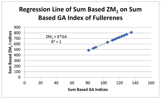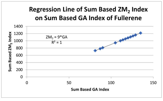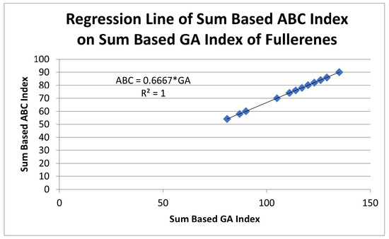 Presently, we shall analyze linear regression between the each of the sum based , R, and indices and the sum based index of fullerenes as calculated in Table 2. The linear dependency relations including the linear regression equation, coefficient of determination and correlation coefficient can be calculated (taken in the form is the number of observations) are given in Table 3.