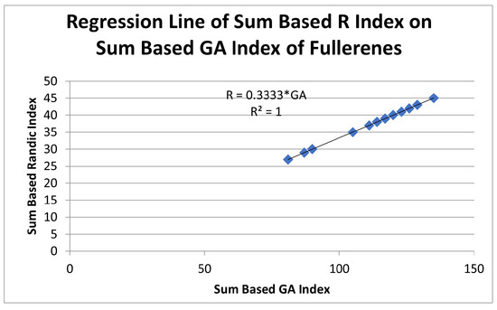 Figure 3 indicates the dependency of sum based R index on sum based index. The figure depicts the coefficient of determination as well as the correlation coefficient, which is This indicates not only that the regression line perfectly fits over the whole data but that there is a strong direct relationship between the indices.