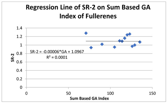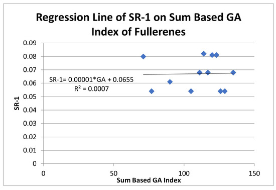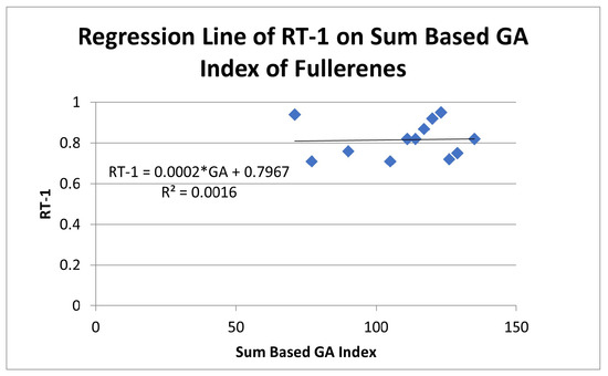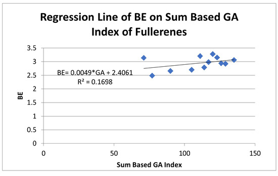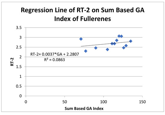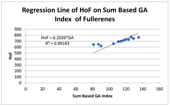 It can be deduced from the Figure 6, Figure 7, Figure 8, Figure 9, Figure 10 and Figure 11 and Table 6 that the linear regression relation of the heat of formation on the GA index fits on most of the data points. The coefficient of determination is , indicating a better goodness of fit to the observations. Thus, the regression line fits on more than 89 percent of data. The correlation coefficient is , indicating a strong positive correlation between the heat of formation and the sum based index.