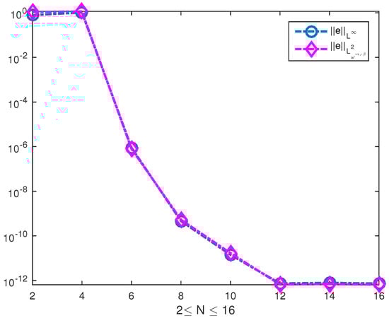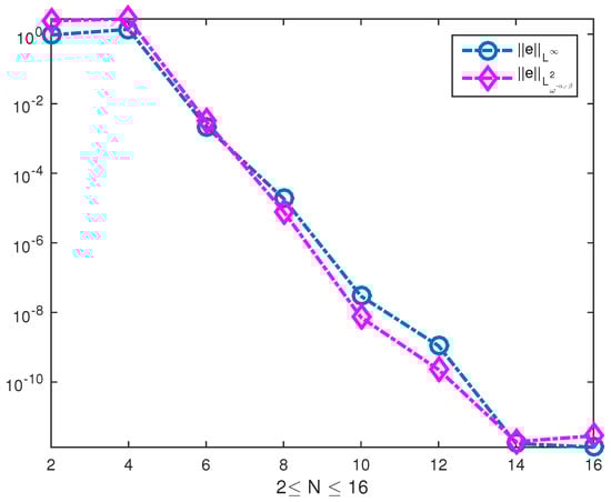 Let , and we solve the matrix Equation (11), and the infinity error in norm and weighted square error in norm for different N which denotes the number of collocation points are listed in Table 1. To show the exponential rate of convergence more visually, Figure 1 exhibits the errors in the and norms versus N. From Table 1 and Figure 1, one can see that the spectral method achieves the exponential rate of convergence, illustrating a fact that the numerical simulations highly agree with the theoretical results.
