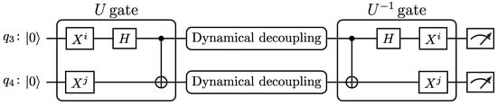 In the two-qubit tests, we followed the same circuit building approach. We started by considering the maximally entangled Bell states previously shown in Equation (1). The circuits used for carrying out dynamical decoupling tests with them are presented in Figure 2.