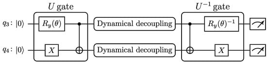 The experiment circuits can be divided into four main parts: state preparation, dynamical decoupling, state decoding, and measurement. We denote the state preparation step with the gate U, which will have a form that will depend on the state being prepared. The state decoding step will consist of applying , the inverse of the preparation gate. For the single-qubit tests, we considered the states |0⟩ and |1⟩. In this case, U will be for the |1⟩ state, while no U gate will be required for the |0⟩ state. The circuits used for carrying out the single-qubit experiments are shown schematically in Figure 1.