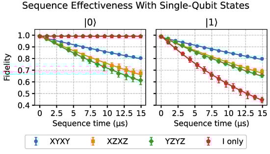The results of the single-qubit experiments are shown in Figure 4. In this figure, we see that applying the dynamical decoupling sequences on the ground state |0⟩ induces a fidelity decay in comparison with the free evolution given by the I-only sequence. This alone would already mean that the experimental pulses are not suitable for this particular simple dynamical decoupling approach, as an unknown state would not be able to be protected without taking further care. With the |1⟩ state, the decoherence process is so quick that the application of the sequences slows down the process, even with the experimental imperfections of the pulses. It can also be noted that the evolution under the XYXY sequence seems to be equivalent in both states. This may be due to the |0⟩ and |1⟩ states’ continuous flipping on the Bloch sphere, as both states travel between the poles of the Bloch sphere during the execution of the sequences.