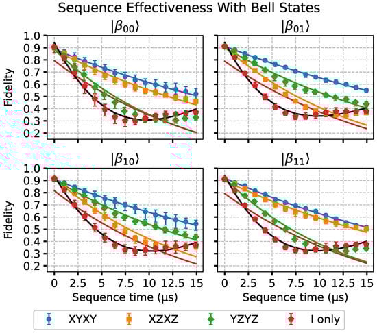where , T, and C have the same meaning as in Equation (11) and f and are also fitting parameters representing a frequency and a phase, respectively. We can note that, for long sequence times, the dynamical decoupling pulses will not be better than free evolution. In this large sequence time region, it can be noted that the free evolution dynamics shows non-Markovian behavior, as the fidelity points do not adjust well to the exponential decay behavior. This makes the damped cosine fit a better choice than the exponential decay fit to describe the data. We obtained that the dynamical decoupling sequences mitigate the non-Markovian component of the two-qubit evolution dynamics, as observed in [10], for single-qubit states in an IBMQ device. This was achieved at least within the sequence times considered. In [22], it is discussed that these non-Markovian effects may arise from different sources, such as: noise from the external pulse controls, residual Hamiltonian terms, slow environmental fluctuations, undesired qubit crosstalk, or coupling to magnetic impurities. However, for short times, there is a clear benefit in using the sequences with these maximally entangled states. It can also be observed that, with all four states, the XYXY sequence is the best among the three.