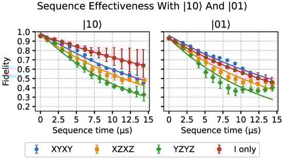 Lastly, in Figure 6, Figure 7 and Figure 8, the results from the more general case with the two-qubit states are presented. In Figure 6, we can see the results considering |10⟩ and |01⟩ as initial states. These kets are written using the Qiskit ket ordering notation [20]. The |10⟩ state would correspond to the case, while |01⟩ would correspond to . We can observe that, for these separable quantum states, there seems to be no clear advantage in using dynamical decoupling with respect to free evolution. However, for the |01⟩ state, the decay slightly slows down with the XYXY sequence.