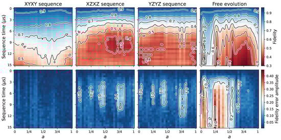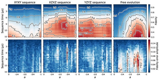 In Figure 7 and Figure 8, the and states would correspond to the and values, respectively. At the top row of the subplots of these figures, the fidelity data represented using color are shown as a function of the a parameter and the sequence time. At the bottom row of the subplots, the figures show the amplitude of the error bars, named “fidelity error amplitude”, as explained at the end of the Section 2. In both figures, we used the same limits for the color bars of the “fidelity” plots. That is, the maximum and minimum values were taken considering the fidelity data from both positive a and negative a situations for comparison purposes. The contours on the figures are shown qualitatively, in order to make the reading of the data easier. It is also important to mention that the results in Figure 7 and Figure 8 will depend on factors such as the device, the qubits used, and their robustness against environmental noise.