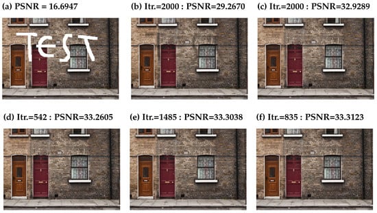 For this part, we apply the Algorithm 1 to solving constrained image inpainting problems (22) and apply the Algorithm 2 to solving image restoration problems (24). As image quality metrics, we utilize the peak signal-to-noise ratio (PSNR) in decibel (dB) [], which is formulated as follows: